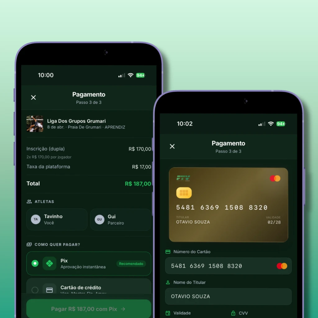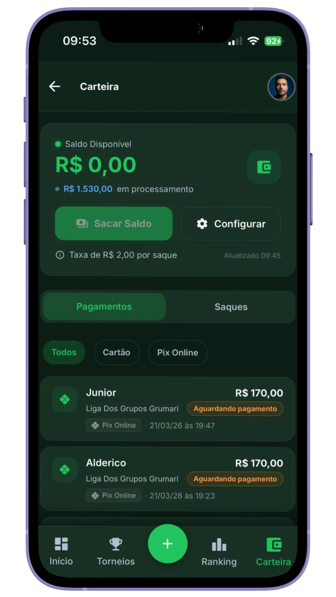 Jogador abre o link, se inscreve, paga com Pix ou Cartão e recebe confirmação na hora. Você não precisa cobrar, conferir nem anotar nada.