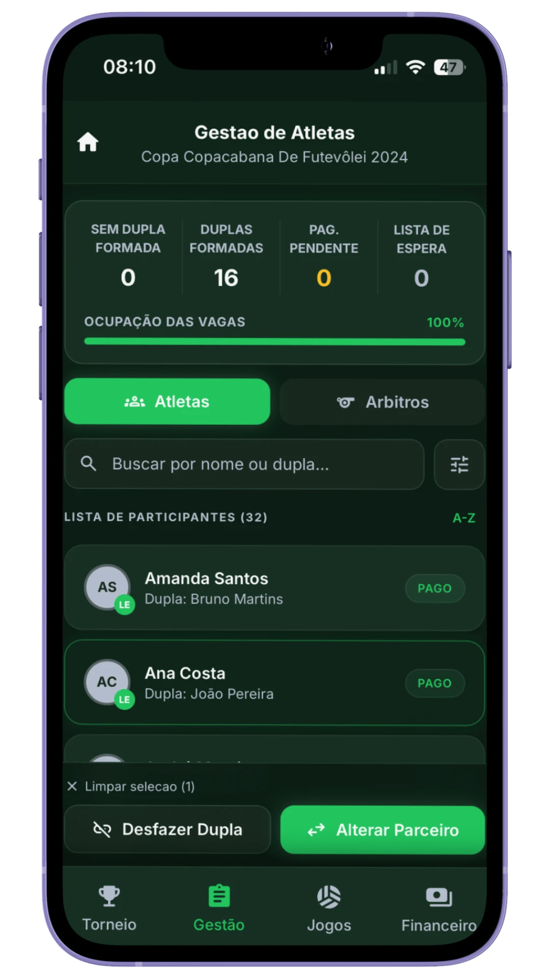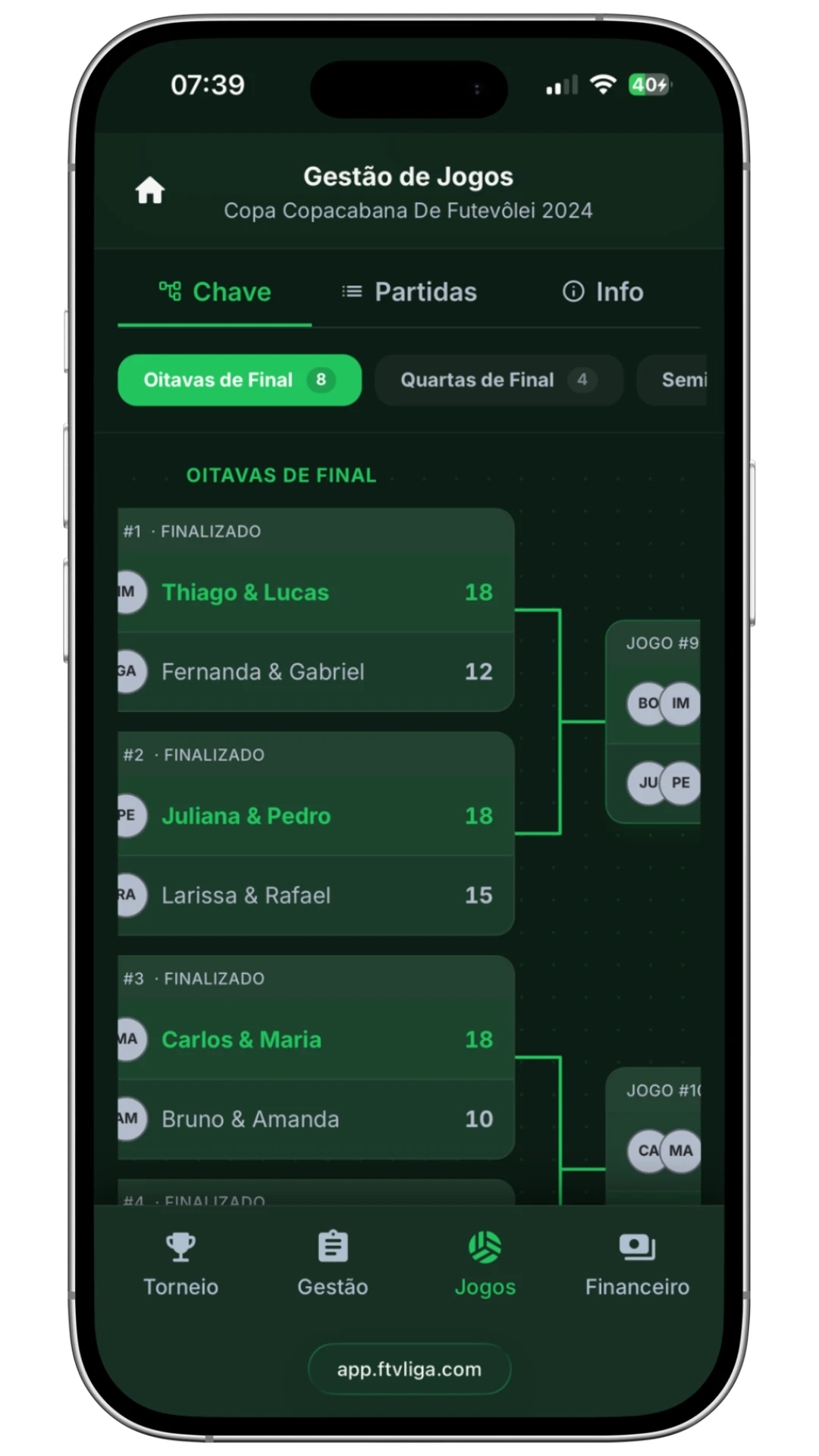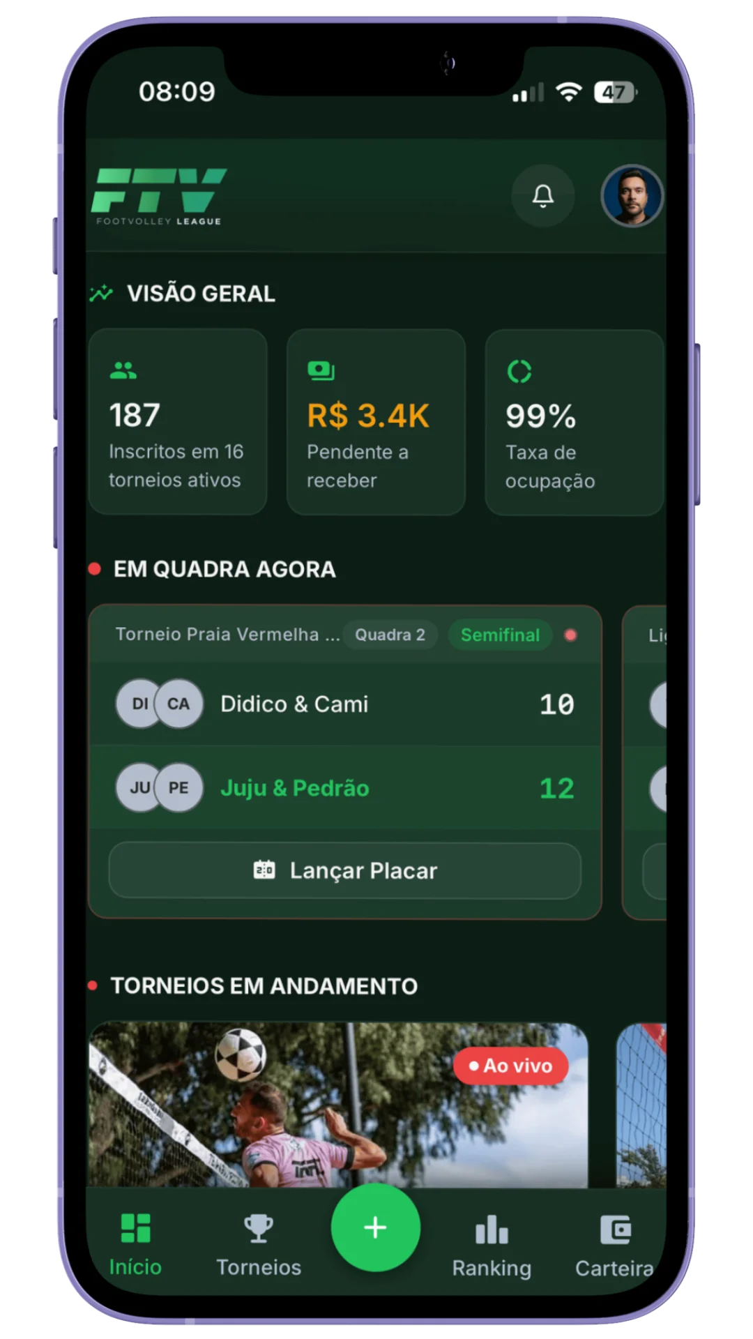 Cada funcionalidade foi pensada para resolver uma dor real de quem organiza torneios de futevôlei.