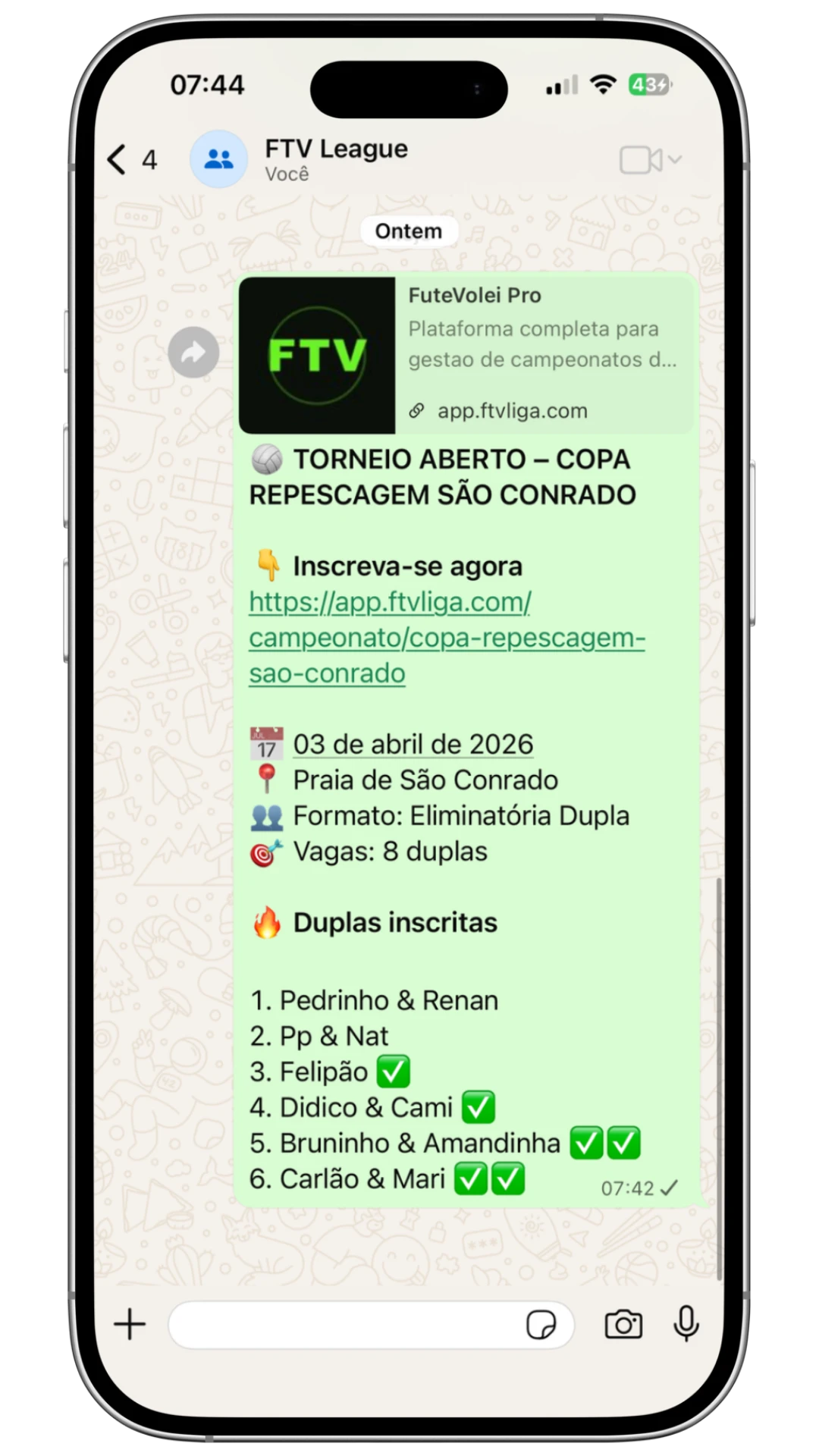 Resultado atualizado em tempo real. Jogador notificado pelo WhatsApp sobre horário, adversário e placar.